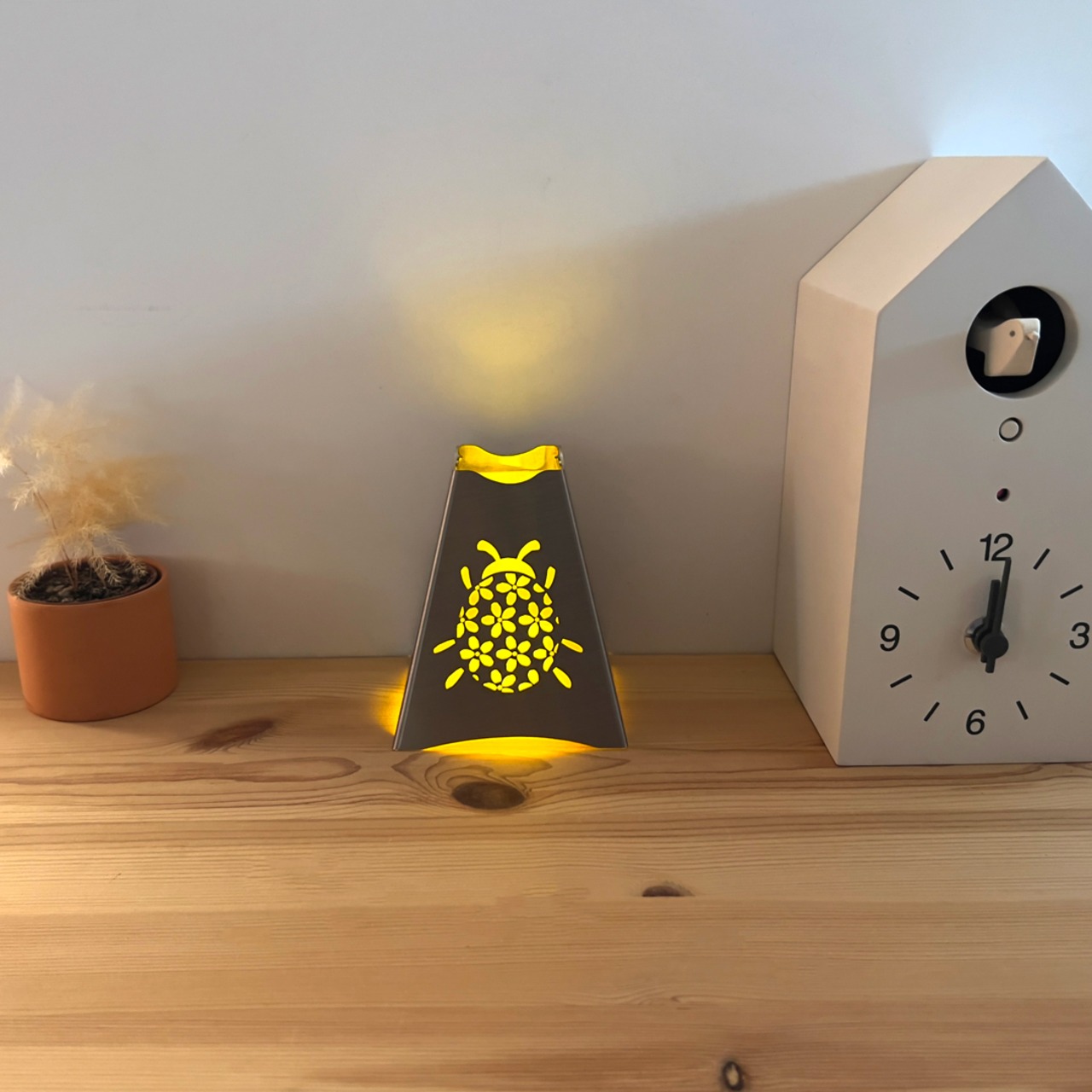 明かりを灯すと切り抜かれたてんとう虫の輪郭と自慢の花柄がじんわりと浮かび上がります。