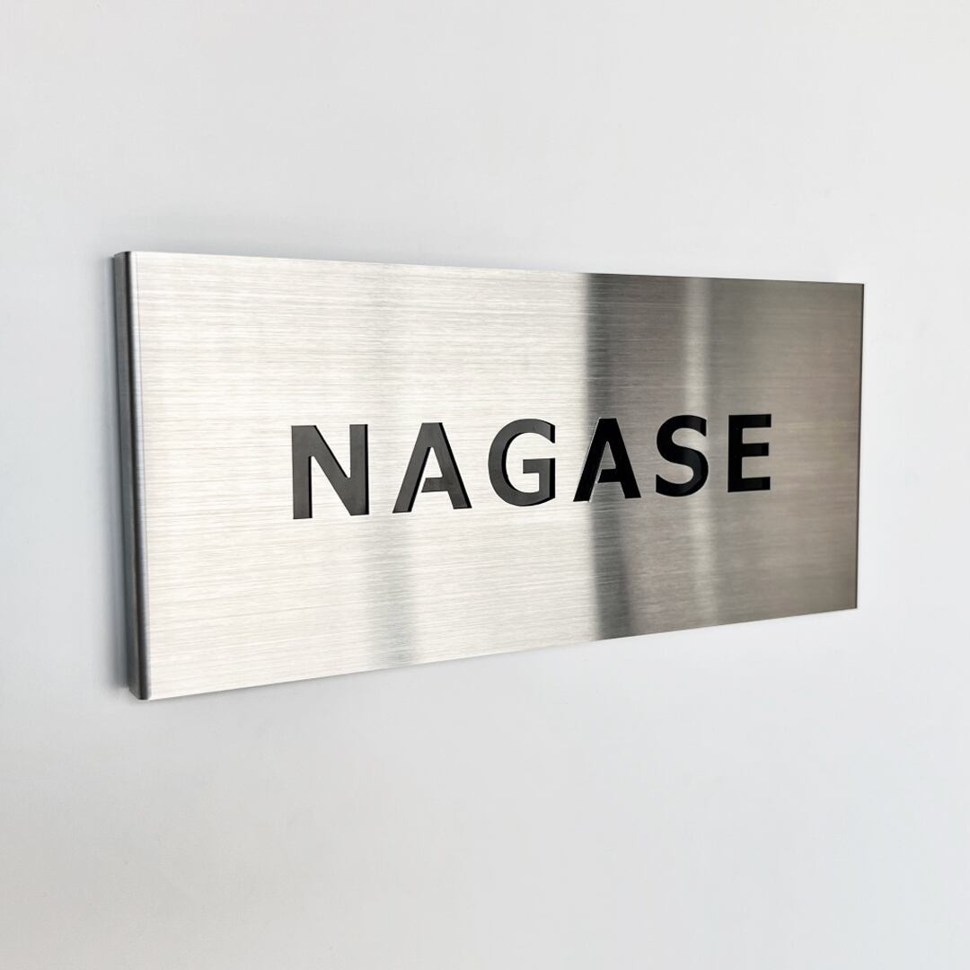 ステンレス製ヘアライン材を使用しており、高級感のある落ち着いたデザインになっています。文字をレーザー加工で中抜きにすることで奥行きのある浮かび上がるような見え方が特徴です。更に両側面を後ろ側へ折り曲げて奥行きをつけていますので立体的に見えるデザインとなっています。ステンレス製なのでサビや汚れが付着しにくく、店舗・ご自宅・オフィス等でご使用ください。