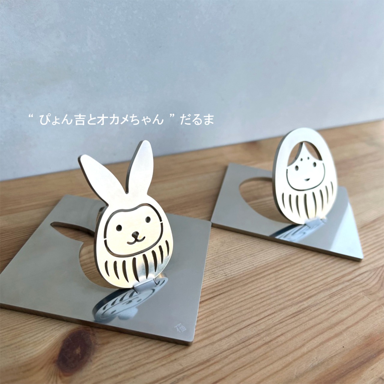 厚みのある1枚のステンレス鏡面材の板をレーザーで切り抜いて、折り曲げて作られた " ぴょん吉 " 達磨と " オカメちゃん " 達磨。